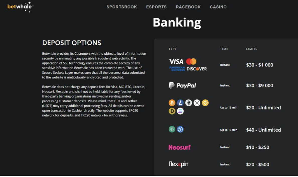 While crypto offers the fastest service, BetWhale also provides robust options for players who prefer traditional or established digital methods:
